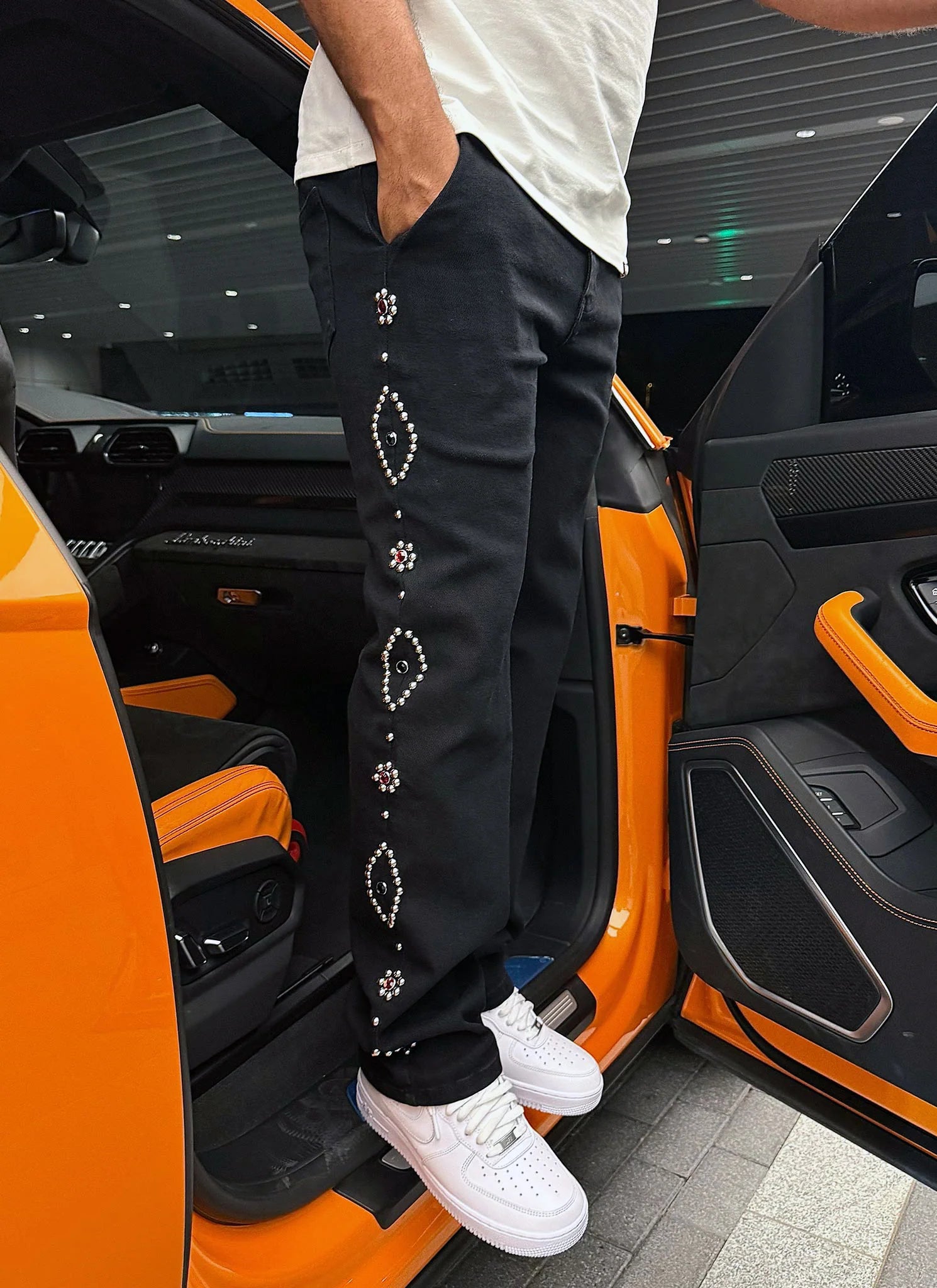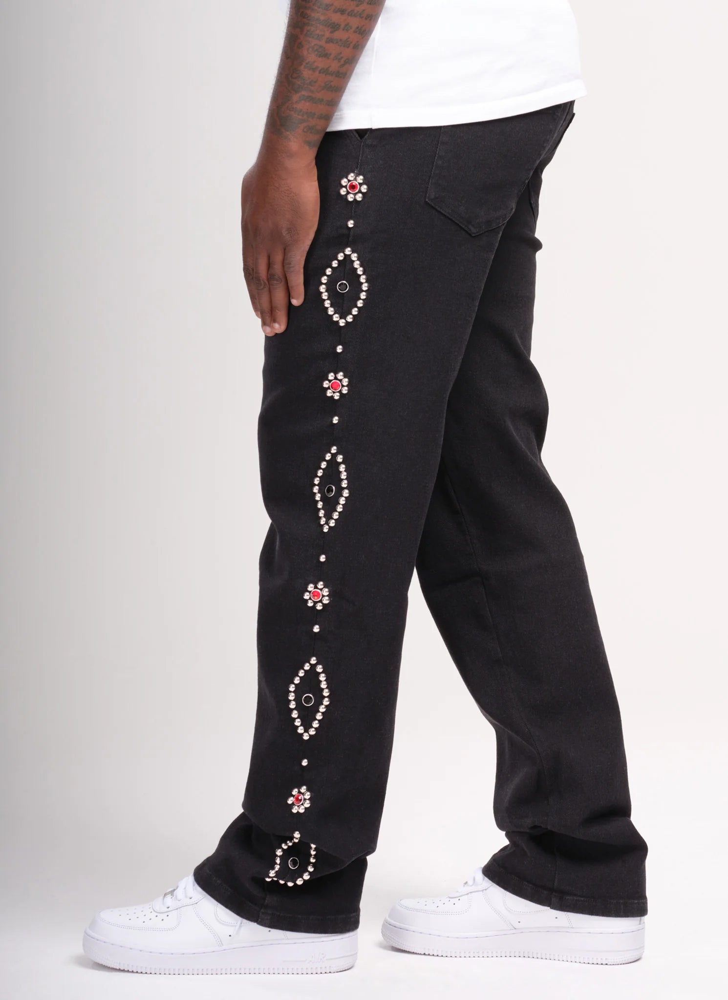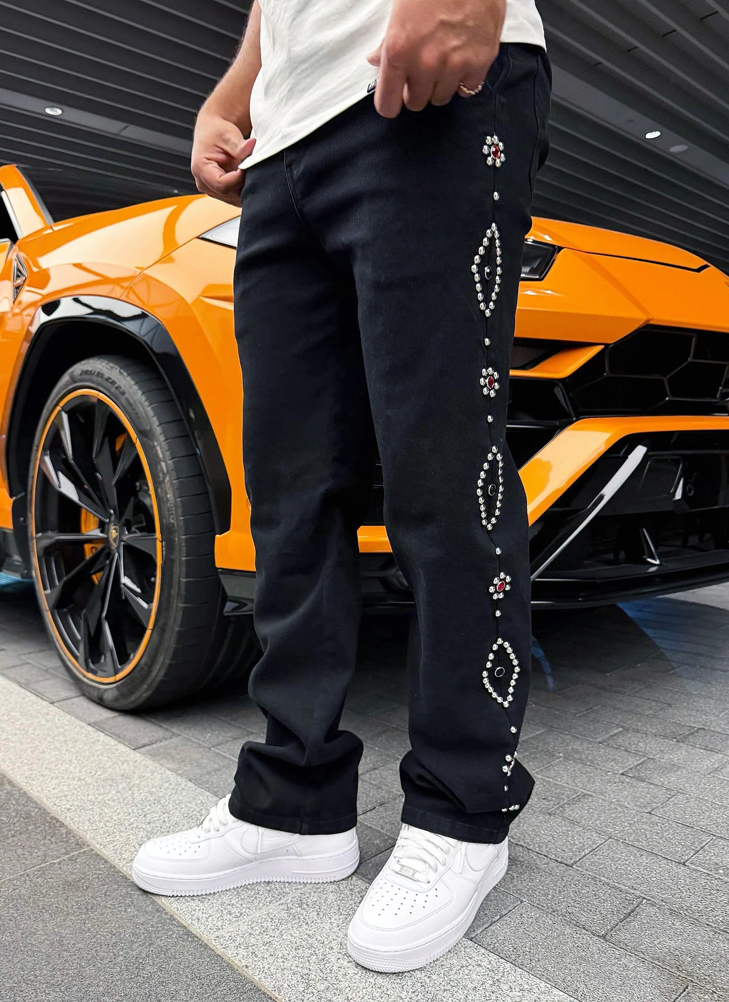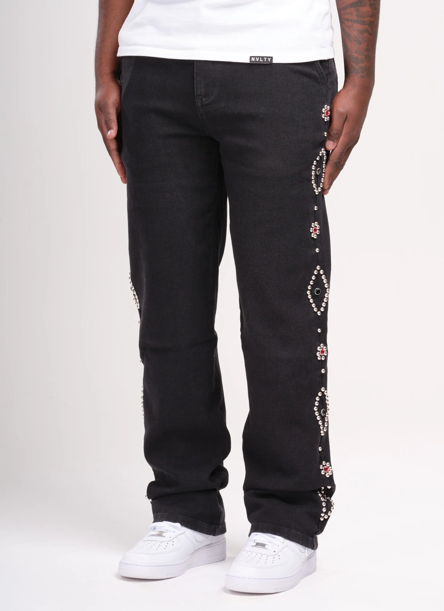 Crafted by NVLTY, these vintage-inspired studded jeans deliver timeless edge with contemporary flair. The classic black denim foundation pairs seamlessly with strategically placed studs that elevate any casual ensemble. Premium denim construction ensures durability and comfort through repeated wear, while the studded detailing adds a distinctive rock-and-roll aesthetic. Perfect for those seeking to blend retro style with modern sophistication. A versatile wardrobe essential that transitions effortlessly from day to night.